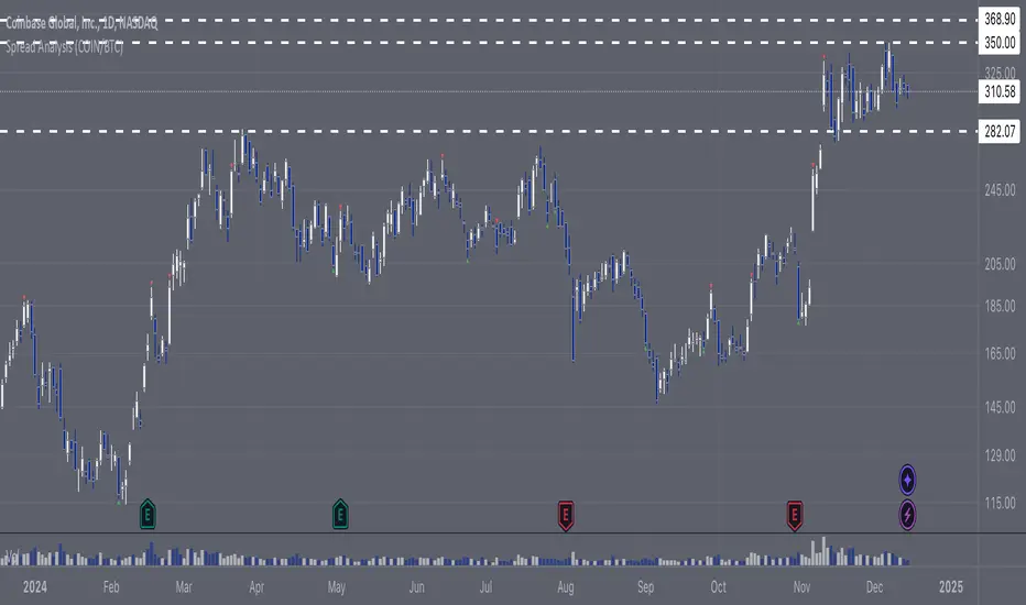 The Spread Analysis (COIN/BTC) indicator calculates the Z-score of the price ratio between Coinbase stock (
