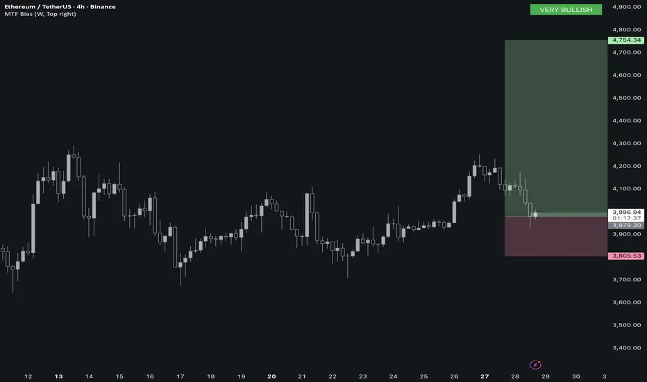 This Bardan Bias Indicator analyzes pure daily chart momentum agnostically across any asset by employing a weighted scoring system based on three universal components: EMA alignment (20, 50, 100 periods), price position relative to these EMAs, and momentum indicators (RSI and MACD). The system objectively awards points for bullish configurations like stacked EMA alignment, price trading above key EMAs, and positive momentum readings, while deducting points for bearish setups, completely independent of the specific instrument. The total score normalizes to a 0-100 scale and classifies into five clear bias categories, providing a single, universal overlay that reveals the underlying daily trend direction for any tradable asset—from cryptocurrencies to stocks to forex—while effectively filtering out minor pullbacks and market noise.