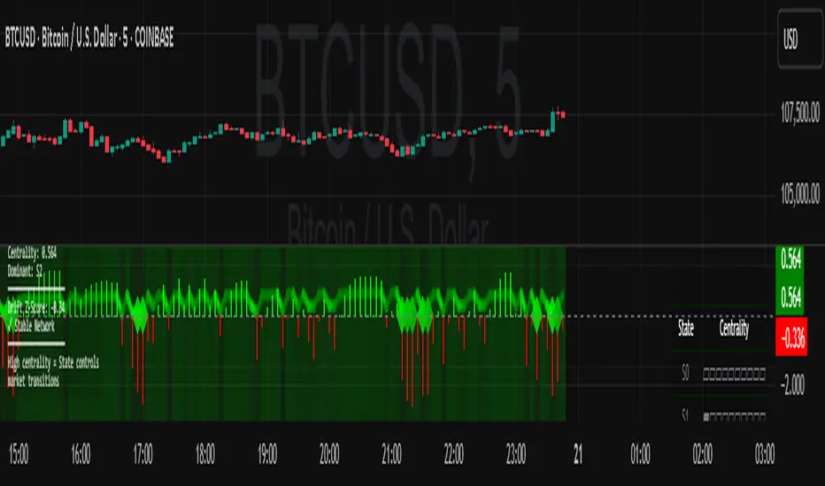 ECD is not a mashup or rehash of standard indicators. It is a novel application of network science and eigenvector centrality to market microstructure, providing a new lens for understanding regime shifts and market transitions. The state network, centrality drift, and dashboard are unique to this script. ECD is designed for anticipation, not confirmation—helping you see the market’s “center of gravity” shift before price action makes it obvious.