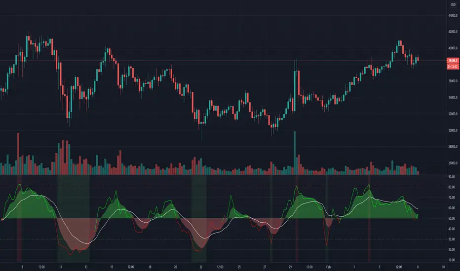 Welcome to the MFI Pro! This indicator uses the Money Flow Index and overlays two EMAs along with different 'under' levels for the buy triggers. It uses the 14 EMA2 length for the white line and the 5 EMA3 length for the waves. The red shaded 'sell' signal is triggered whenever the MFI climbs above the 80 level and the green shaded 'buy' signal is triggered whenever the MFI dips below the 30 level. A couple ways to use this indicator is wait until the MFI crosses above the 14 EMA for buy signals or below it for sell signals. You can also wait for the waves to cross above or below the 50 line (if it crosses above the 50, buy, if below then sell). Another way to use it is wait until the EMA3 wave crosses above the EMA2 white line for buy signal or if it crosses below the white line for a sell signal. You can also adjust the settings of the overbought and oversold levels which will change your buy/sell signals or change the length of the waves to your liking.