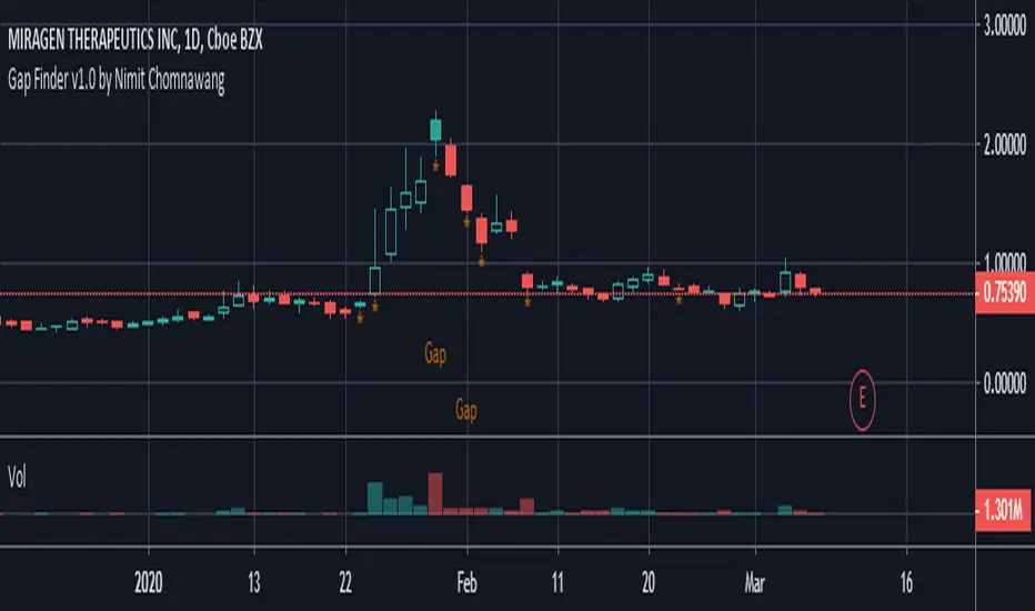 This indicator shows locations of price gaps (or candle stick discontinuities). It prints out the labels "Gap" under the price bars where gaps occur. Asterisk " * " is used to pin point the bars with gaps.