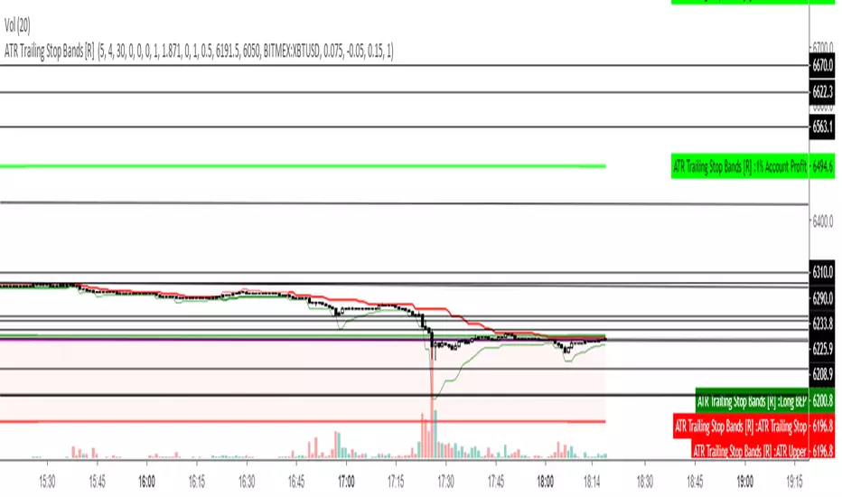 Major update, and a nightmare to code. Added optional ATR Heat Bands, showing multiple's of 1 ATR, could be used for DCA. Big addition is the Risk Management side, it now shows Entry, Break Even Point (taking into account fees), 1R up to 5R (for Risk:Reward), and how much price has to move to earn 1-3% on account balance, which are good conservative daily profit targets. I think these all work now on XBTUSD, ETHUSD, and BitMex alts. Please help test on other exchanges and give me feedback, so I can get them compatible on Bitfinex and Binance for example.Nota Keluaran