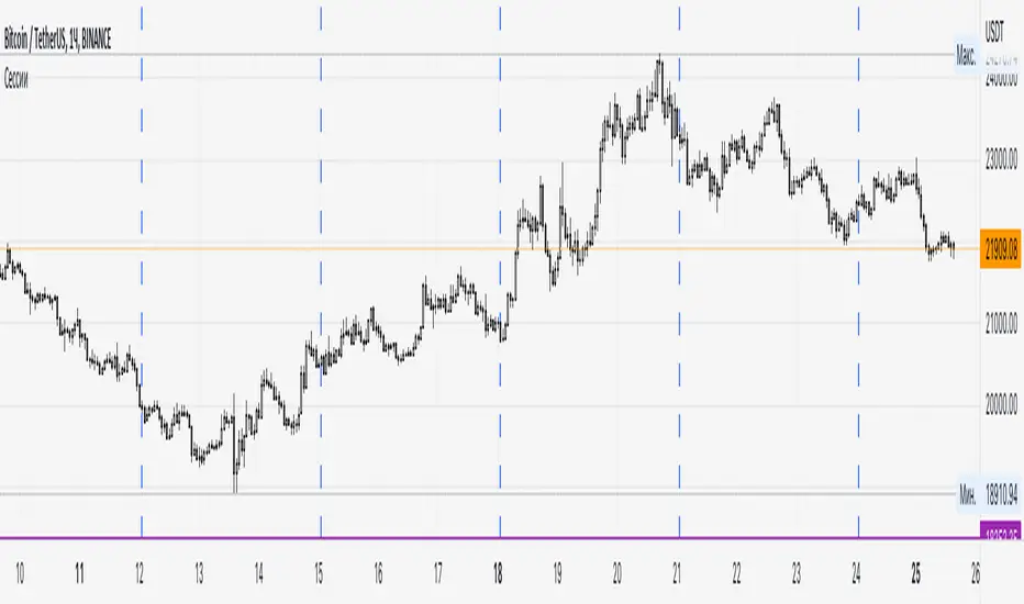 Очень простой индикатор, который строит вертикальные линии на графике, чтобы визуально указать границы сессий. Можно задавать любой целевой таймфрейм, который больше текущего и кратен ему.
