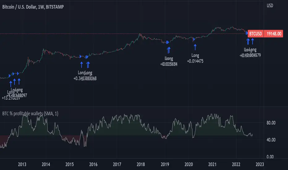 BTC Profitable Wallets Strategy - plots the percentage of profitable BTC wallets and places long orders when the profitable wallet share crosses above 50%, historically a very accurate point to catch the next Bull Run early.