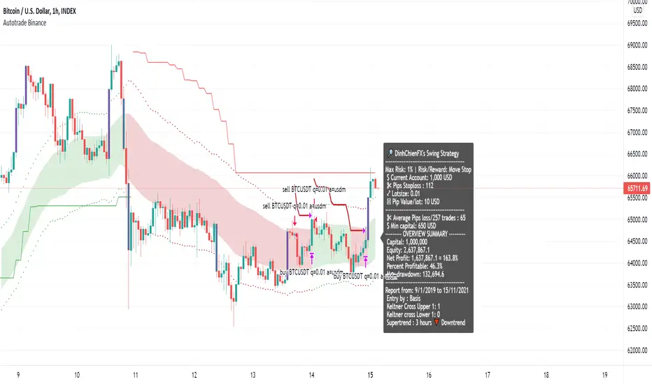 Open Buy: Supertrend & Keltner channels are Long. Buy when closes candle crossunder Basis line and closed above Lower Keltner