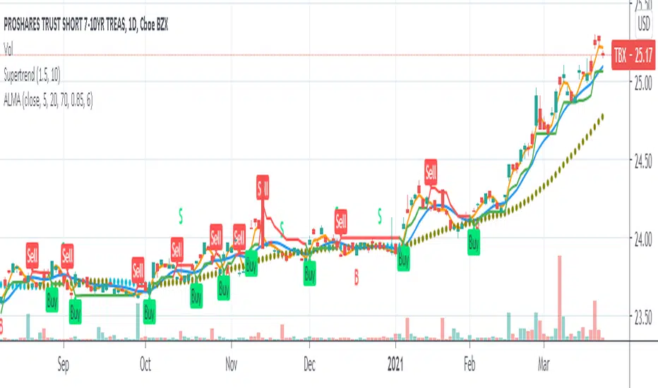 The drawback of Moving average crossing strategy is the too many crossing during a range trading, therefore, a third ALMA is used to show the trend of the ticker's price as a reference.
