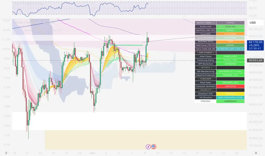 Part of a 7-indicator macro series. Combines yield curve dynamics, VIX structure, employment data (jobless claims, NFP), ISM manufacturing, US-Japan carry trade flows, and consumer sentiment into a single adaptive stress score. Color-coded regimes guide strategy from "Aggressive" to "Buy the Crash."