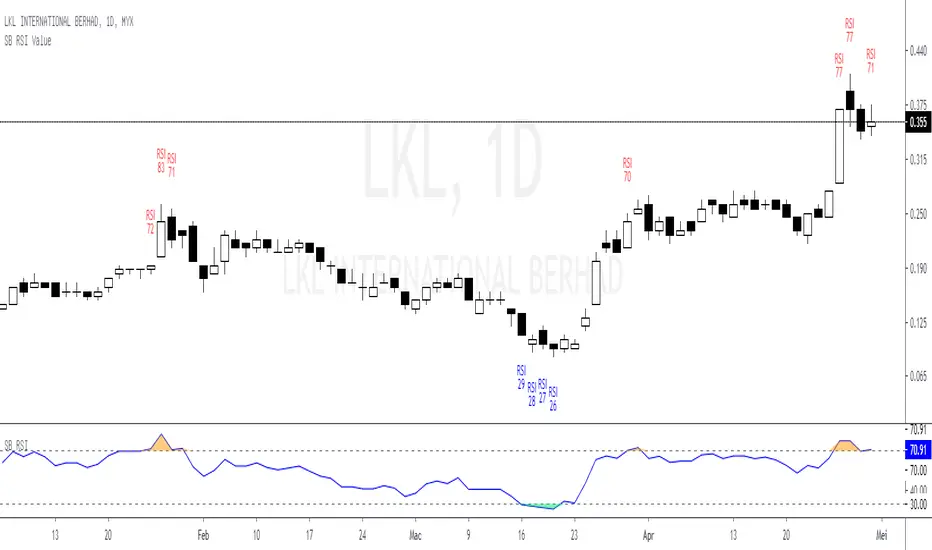 This indicator display the RSI value on chart overlay when RSI cross above overbought or below oversold level.
