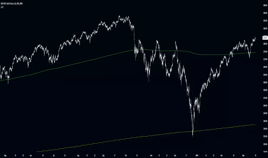 This multi-timeframe 200-period simple moving average uses an improved calculation to accurately calculate the indicator's value with every new bar on the time frame your chart is set to. Previously the indicator only recalculated with every new update on the timeframe used in its security function. This means that this improved script plots the real, current value of your indicator across your chosen timeframes on your chart's resolution and no longer only plots only the indicator's monthly/weekly/daily/4 hour/ect closing value on the your chart.