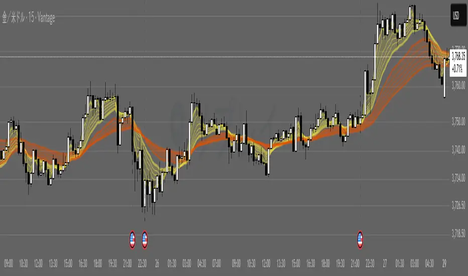 • Dynamic Background Shading: The script can shade the chart’s background depending on whether the fast ribbon is above or below the slow ribbon, giving a quick visual cue for trend direction (uptrend vs. downtrend).