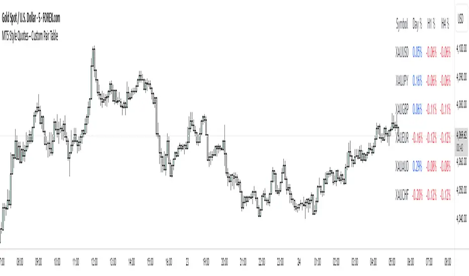 Designed with simplicity and functionality in mind, this indicator is ideal for intraday traders, swing traders, or anyone who wants to keep an eye on multiple markets efficiently. It works for currency pairs, metals like gold (XAUUSD, XAUJPY), or any TradingView-available symbol. The table is positioned at the top-right corner of the chart and automatically adapts to the number of symbols entered.