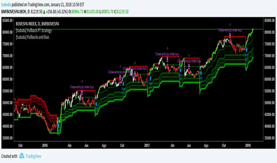 Programado para timeframe diário, porém é possível configurar as faixas de pullback para menos de 1% (ex. 0.5) para daytrade. Além disso, o script também fornece barras de cores direcionais com pouco atraso, detectando swing highs em formação.