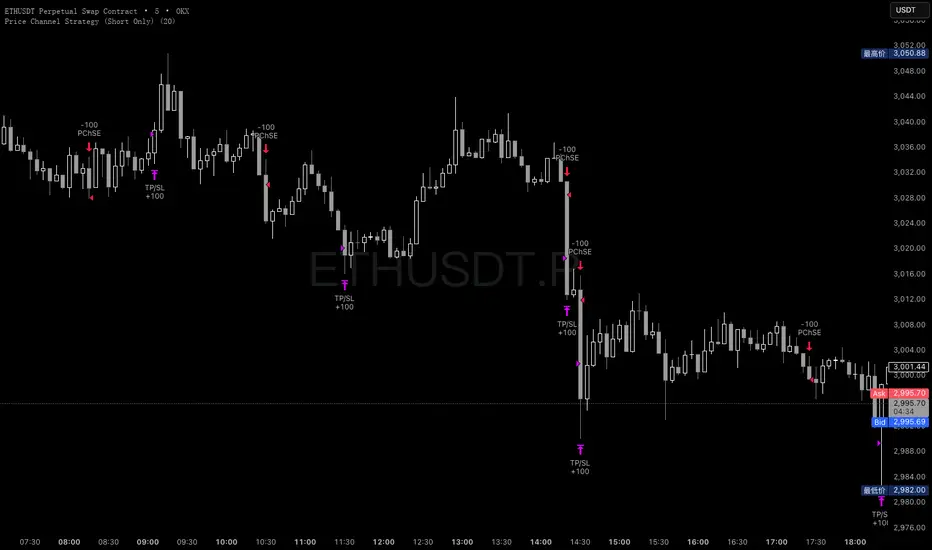When the market breaks below this 20-bar low, a stop entry is triggered to open a short position.