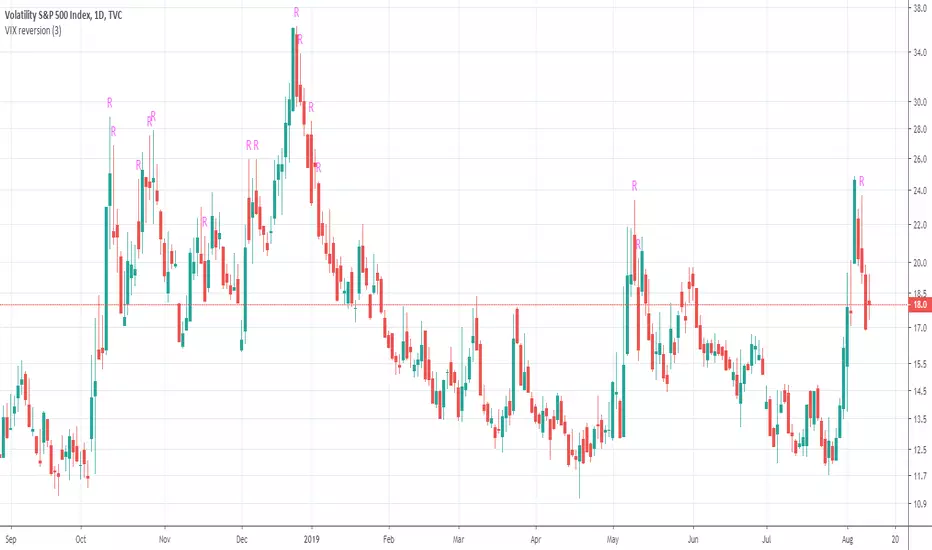 This indicator shows these reversions (3 points as default) when the VIX was over 20 points. The character "R" is then shown directly over the daily column, the VIX need not to be loaded explicitly.