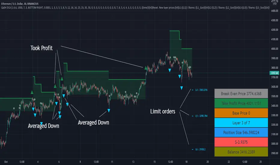 When the specified entry condition has occurred, the indicator will set up several limit orders below the current price. If price goes up a specified amount, then the layers will be overwritten at the higher prices. If price goes down and fills the first layer (limit order), then the Take Profit price is plotted and will be sent in an alert. If more layers are filled, then the TP price will move down accordingly as it’s based on the average entry price (alerts on each TP update). This action of lowering the average entry and TP price mitigates your risk, and increases the likelihood of a Take Profit event happening. More entry conditions will be added as time goes on, although complex entry conditions are not necessary for the strategy to work. All the meat of the DCA strategy is in the layer placement, order volume , and TP %.