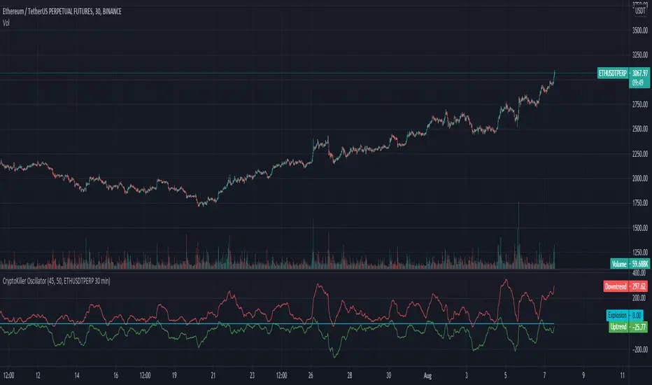 The CryptoKiller strategy to provide the entry and exit points incorporates this oscillator in its script for obvious reasons, but we believe that by using this strategy, it is necessary to provide the oscillator to the user, so that the user can know in advance when he will have to pay a little more attention to the chart.