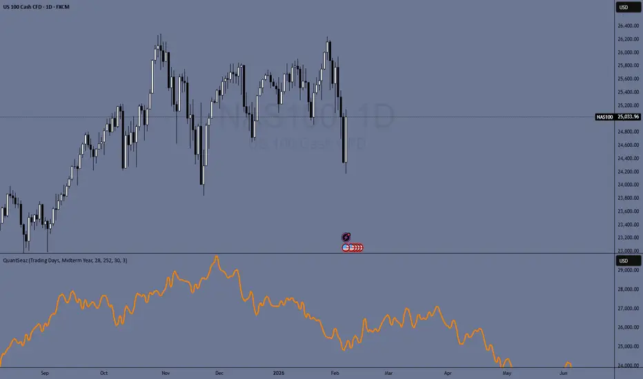 The indicator allows you to switch between Trading Days (stocks/forex) and Calendar Days (crypto), apply U.S. election cycle filters, and analyze precisly historical data. The projected curve is detrended to isolate true seasonal structure and then scaled to current market volatility for realistic visualization.