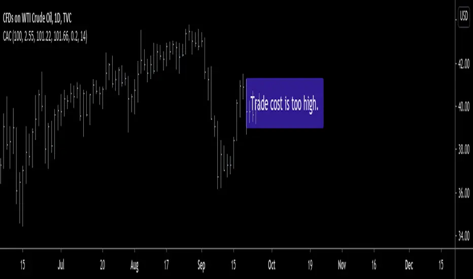 The ATR cost parameter defines the maximum amount of trade costs you are willing to take on. It defines the distance (in ATR units) needed to recover trade costs. For example, if the ATR cost parameter is set to 0.20, that means the indicator will only let you trade if costs are below 0.20 ATR. In other words, the price will have to move in the direction of your trade by 0.20 ATR units in order to break-even.