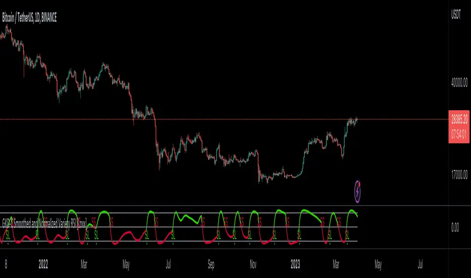 Smoothed and Normalized Variety RSI is calculated by finding the RSI then smoothing that RSI output using a proprietary smoothing algorithm. This output is then normalized. This process produces a better quality RSI signal by reducing noise and better identifying reversal areas.