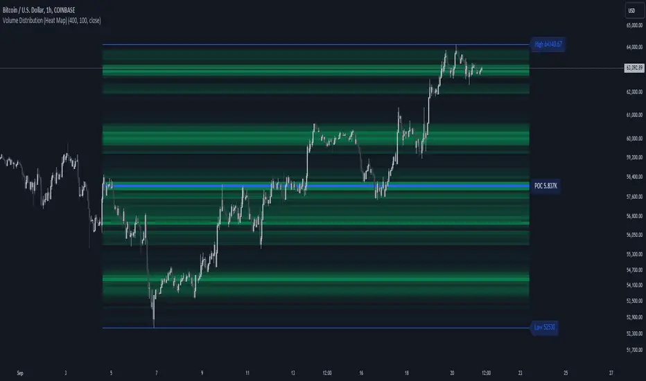 This Pine Script indicator, "Volume Distribution (Heat Map)" is designed to visualize the distribution of volume across different price levels over a specified lookback period. Here's a detailed breakdown of its functionality and features: