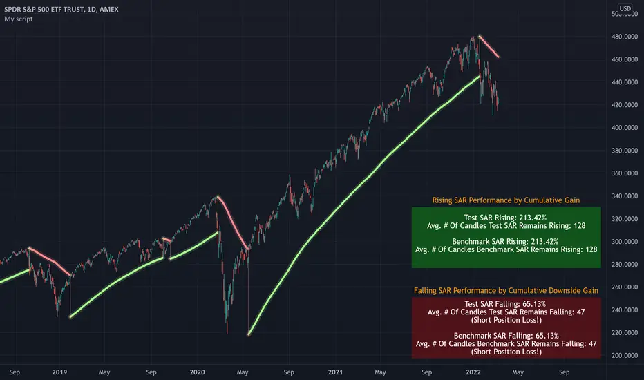 When changing the SAR parameters the script will recalculate and display the rising SAR and falling SAR performance of the modified parameters. The script works for any asset on any timeframe.