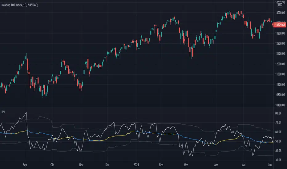 This Indicator displays a normal RSI with overbought/-sold lines which is calculated with donchian channels, pivot channel, bollinger bands and three horizontal lines.