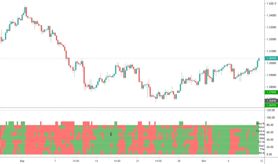 As per all of my indicators, the system is simple - The more green lines you see, the stronger the buy signal. The more red lines you see, the stronger the sell. If its a 50/50 mix of red and green, then don't trade.