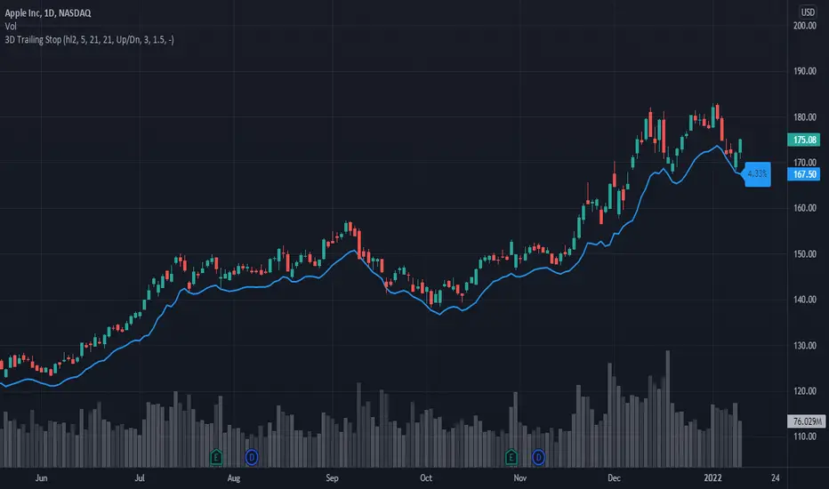 There are a few ways it can be used, for example one may wish to enter on a 50 or 100 bar high/low breakout and use the 3D Trailing Stop as a indicator when to get out of the trade. You could exit once price goes below the trailing stop, or use the previous bar trailing stop value as the level for a quicker exit.