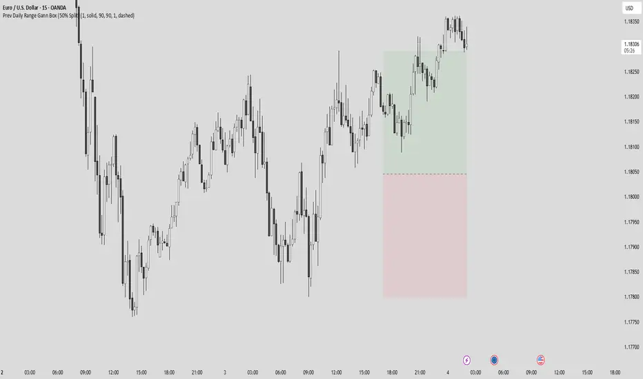 This indicator draws a Gann-style projection of the previous day’s range, split precisely at the 50% equilibrium level.