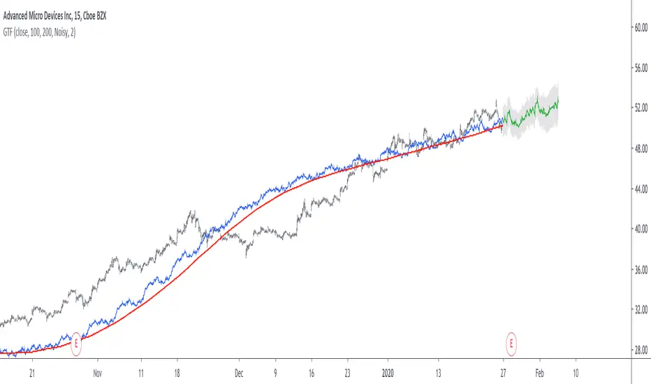 Good forecasts mostly occur when the price is close to the trend estimate, this include the following highlighted periods on AMD 15TF with default settings :