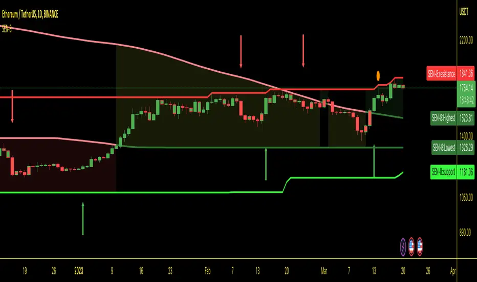 Resistance: The resistance line is calculated using the highest high price over a specified number of periods. This line represents a price level where selling pressure is expected to increase, making it more difficult for the price to rise further. Traders often consider resistance levels as potential entry points for SHORT positions or exit points for LONG positions.