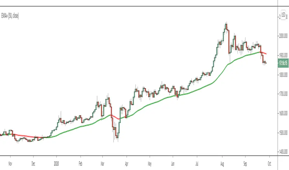 This is a modified version of the exponential moving average indicator to change color based on trend (red/bearish if price has closed below EMA, green/bullish if price has closed above EMA).