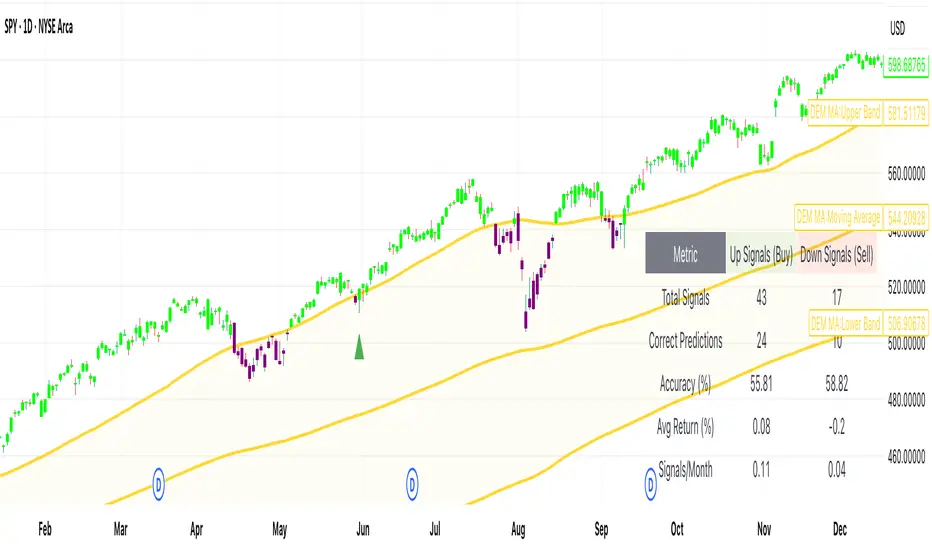 [DEM] Moving Average Signal (With Backtesting) is designed to generate buy and sell signals using a highly configurable moving average system with over 20 different moving average types (including EMA, SMA, HMA, ALMA, McGinley, TRAMA, and others) combined with dynamic upper and lower bands based on standard deviation or ATR multipliers. It also includes a comprehensive backtesting framework to evaluate the historical performance of these signals. The indicator overlays directly on the price chart, plotting the moving average with upper and lower bands while coloring bars green when price is above the upper band, red when below the lower band, and purple when between the bands. The strategy generates buy signals when price crosses above the upper band after being below it for one bar but above it for the previous three bars (indicating a breakout after brief consolidation), and sell signals under opposite conditions with the lower band, creating a momentum-based system that filters for sustained moves beyond the moving average envelope while offering extensive customization options and integrated backtesting metrics.
