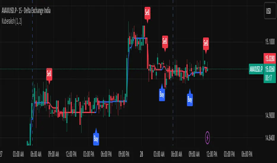 Kuberaksh is a dynamic, trend-following indicator designed to identify market direction and potential reversals with high clarity. Built on the core logic of the HalfTrend, this script provides traders with clean, actionable signals and visual confirmation of channel deviation.