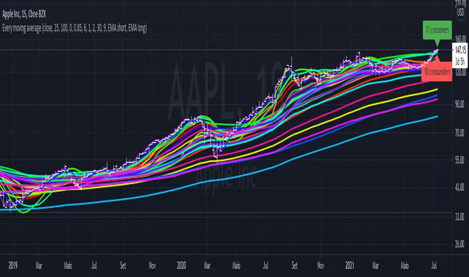 The purpose of this script is to plot in the same graph every single type of moving average that I could think of, so you can find the ones that are better for your timeframe and for your asset. Once you add it, disable those types that doesn't seem to serve your purpose, until you can select one you like.