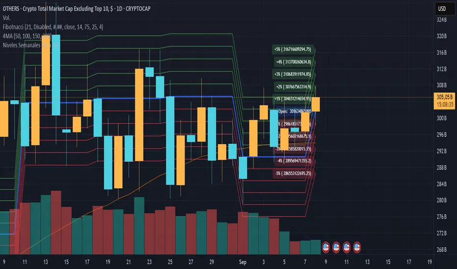 This indicator automatically plots key percentage-based price levels above and below the current week's opening price. It is designed to provide traders with a clear map of potential intra-week support, resistance, and target zones based on clean, mathematical levels.