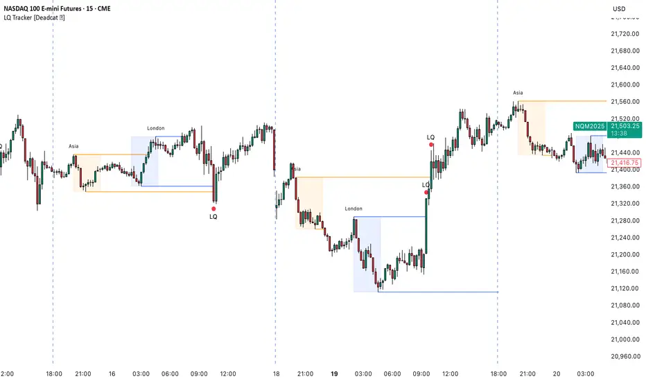 LQ Markers: Red "LQ" circles when session levels swept during trigger hours