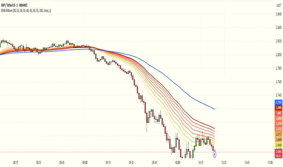 The script plots 8 EMAs with periods ranging from 20 to 55, creating a gradient ribbon effect.