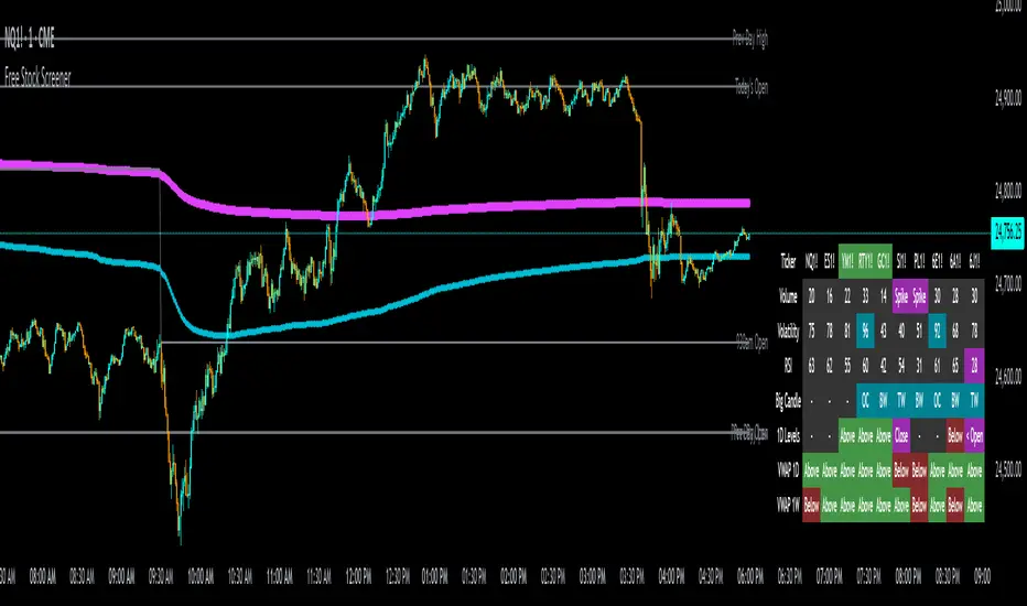 The main purpose of the screener is to scan other markets and notify you of potential good trading opportunities such as price bouncing off of the daily levels or VWAPs. It can also be used to know when price is trending according to the VWAPs and daily levels. Lastly, you can use it to know how the volume and volatility trends are currently which gives you more confidence in taking a trade with this data when volume and volatility are present.