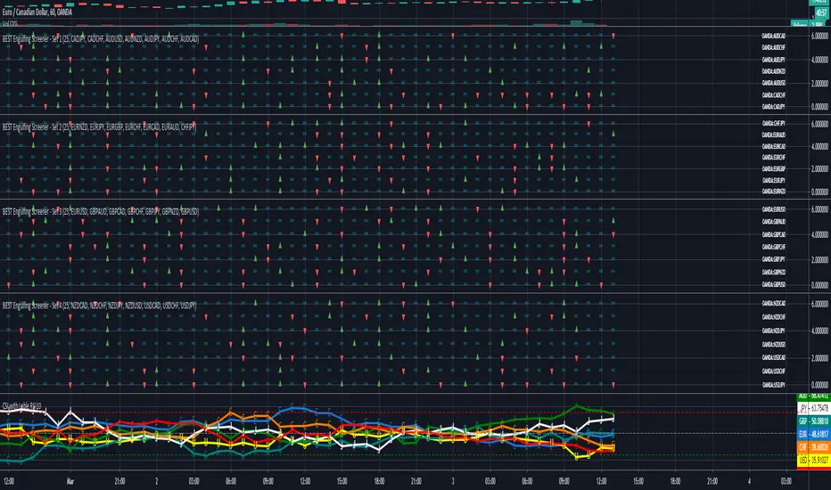 Once all four scripts are added to a chart, you find the UP and DOWN arrows, which represent a bullish or bearish engulfing. Look at the bearish candles, and compare to CSM to see if it is in line with Red and Green. If EURUSD has an UP arrow, and you CSM shows EUR is green and USD is red, it is a valid candle. Then open that chart and see if there is a valid entry based on the price action.