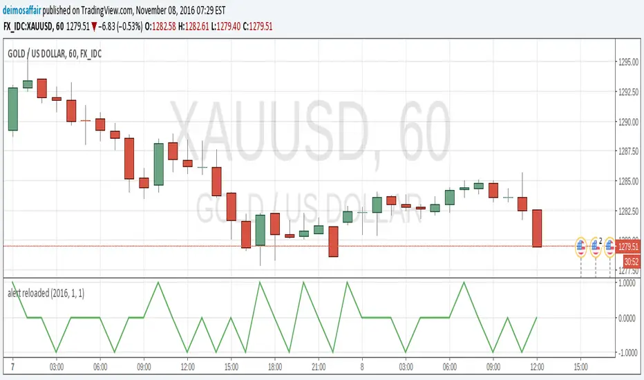 The function does NOT create the alert automatically, what is does is introducing a new option in the alerts popup. While in the v1.0 of my script the alert was triggered checking for the plot value against 0.9 or -0.9, in this example the alertcondition() function just fires the alert by itself.