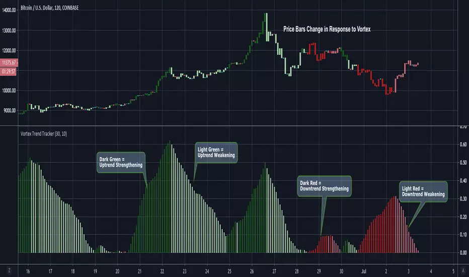 One way to trade using this vortex is to enter a long position when the bar color changes from red to light red. This would mean that the downtrend is decreasing in strength and an upwards reversal is likely to occur soon. Then, traders can exit their long position when the bars change from dark green to light green. When that color change occurs it means that the uptrend is running out of steam and price is unlikely to continue its upwards climb.