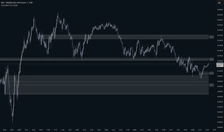 Cozys Black Van Candles is a versatile, fully customizable overlay indicator designed to visually highlight multiple key candle structures on your chart. It allows traders to track precise OHLC levels and midpoints for a series of user-defined candles, offering a clear visual representation of market action. The indicator is optimized for clarity, flexibility, and session-based analysis.