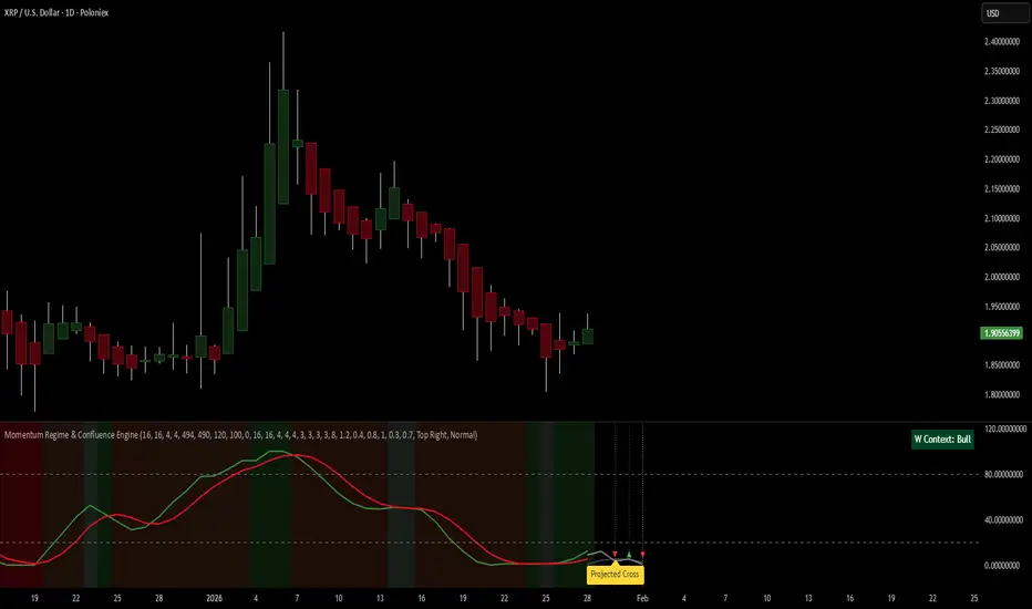 Momentum Regime & Confluence Engine is a Stochastic RSI–based momentum framework designed to display live momentum state, higher-timeframe regime context, and an optional pattern-projection timing overlay in a single indicator pane.