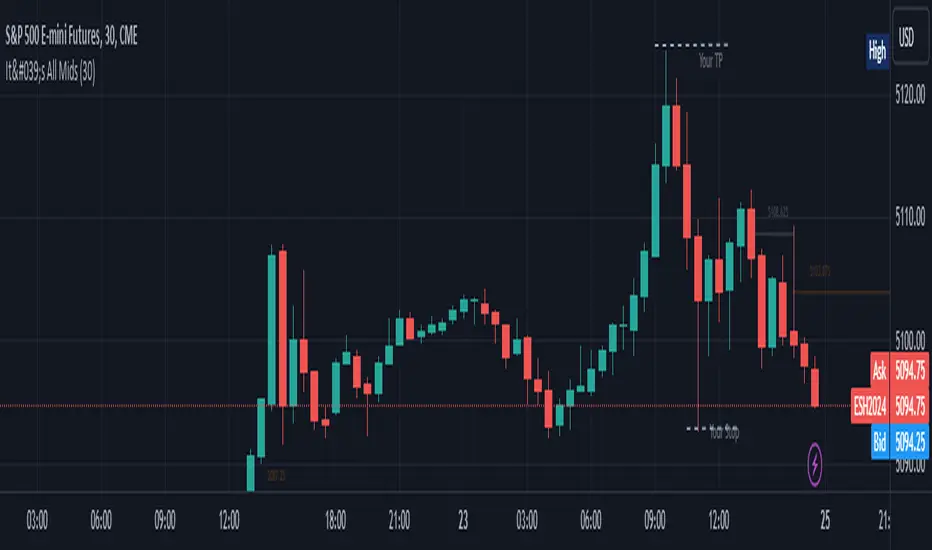 It's All Mids extends mid-lines of a candle forward until the price revisits (covers) the midpoint. A higher timeframe can be used for the mid candles than the chart (but not the reverse). There is no data to support this is a meaningful concept.