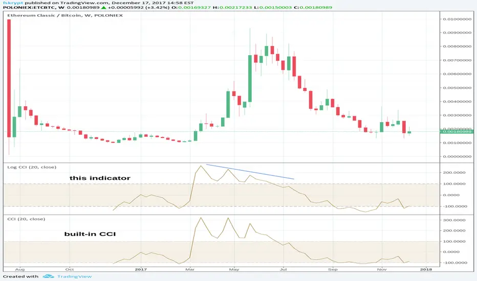 Same indicator as CCI except calculated in log-space. Expected to do better on high-volatility charts, and in some cases (illustrated with ETC-BTC) may provide earlier sell signal.