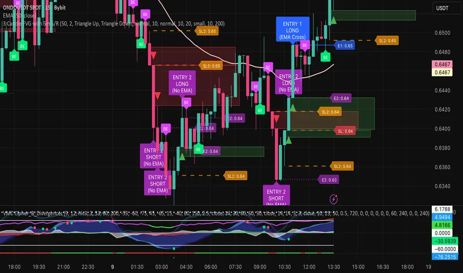 Indicates entry at 3 consecutive candles in the same direction where the middle candle has an FVG and it crosses the EMA.