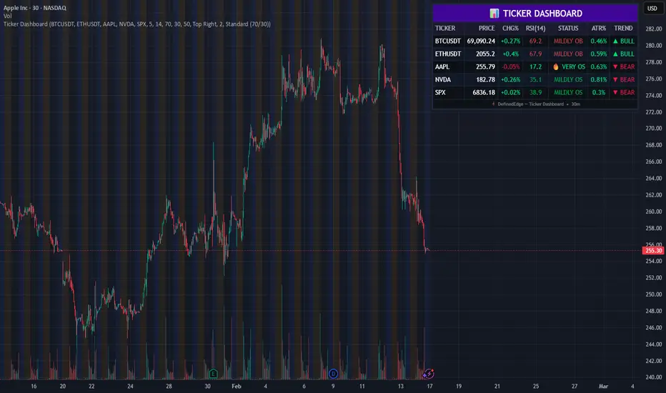 Quick note: When changing tickers in the settings, make sure you pick a valid symbol from TradingView's symbol search (e.g. BINANCE:BTCUSDT, NASDAQ:AAPL). If you enter an invalid ticker, the dashboard won't load. If you only need 3 tickers, set "Active Tickers" to 3. The remaining ticker slots won't be displayed so you can ignore them.