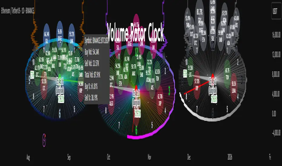 The Volume Rotor Clock is an indicator that separates buy and sell volume, compiling these volumes over a recent number of bars or a specified past period, as defined by the user. This helps to reveal accumulation (buying) or distribution (selling) behavior, showing which side has superior volume. With its unique and beautiful display, the Volume Rotor Clock is more than just a timepiece; it's a dynamic dashboard that visualizes the buying and selling pressure of your favorite symbols, all wrapped in an elegant and fully customizable interface.
