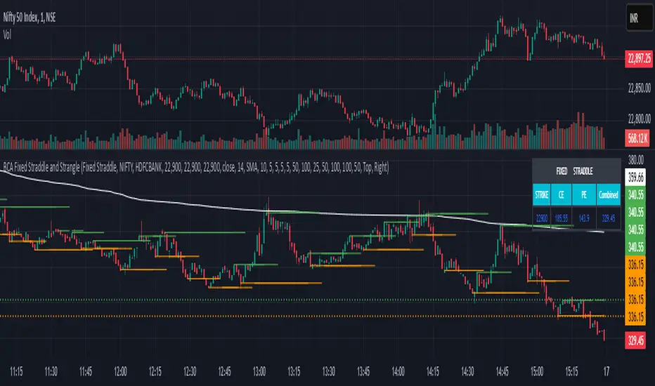This indicator allows traders to analyze straddle and strangle positions using pre-set strike prices. It dynamically plots resistance and support levels based on price movements using swing HIGHs and LOWs, plots potential stop-loss levels using ATR Stop Loss combined with other customizable indicators like Moving Averages, SuperTrend and VWAP